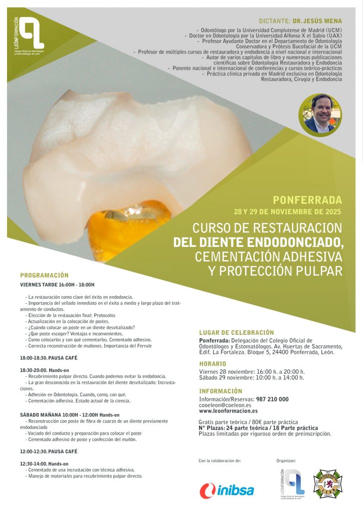 Los próximos días 28 y 29 de noviembre se celebrará en Ponferrada el Curso de restauración del diente endodonciado, cementación adhesiva y protección pulpar. Correrá a cargo del Dr. Jesús Mena y tendrá lugar en la Delegación en Ponferrada del Colegio Oficial de Dentistas (Av. Huertas de Sacramento, Edif. La Fortaleza. Bloque 5).
